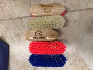 Grooming Brush engraved with the Beauty's Haven Logo. Available in blue, pink or natural. Wood handle, soft bristles.